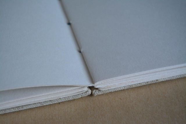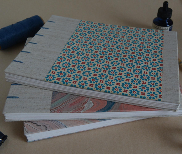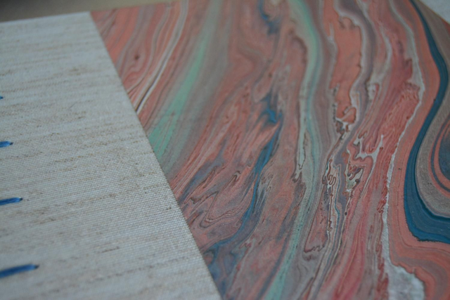 Carnet à dessin, couverture en toile de lin écru et de papier marbré.