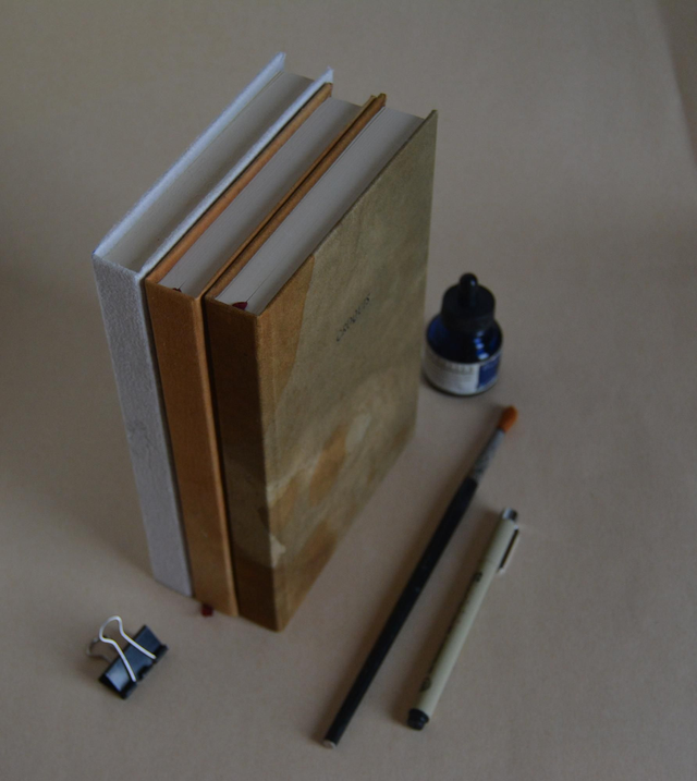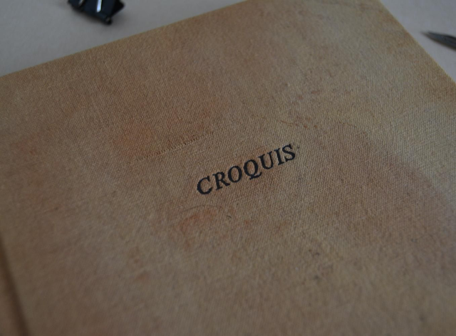 Ce carnet est le fruit d'une belle collaboration artisanale avec Zetilde qui a réalisé la teinture végétale du tissu de couverture, j'ai réalisé tout le reste du carnet. On obtient ainsi un carnet au couleurs et formes très brut, j'y ai ajouté une dorure du mot croquis dessus. Le carnet est un carnet de croquis constitué de 216 pages en papier 100g idéal pour le croquis au crayon, feutre, encre ...