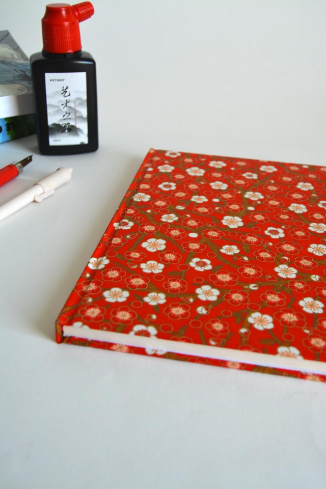 Carnet de notes en papier japonais à motifs de cerisiers japonais rouge.