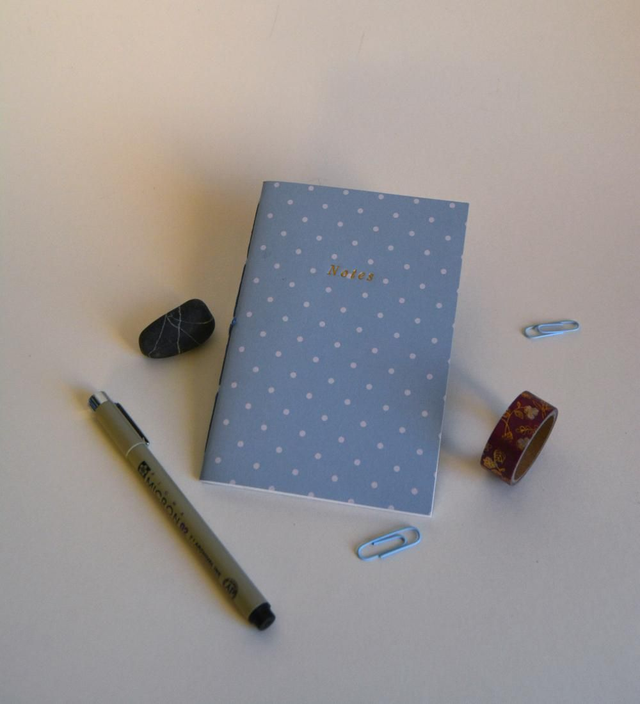 Petit cahier bleu à pois blancs