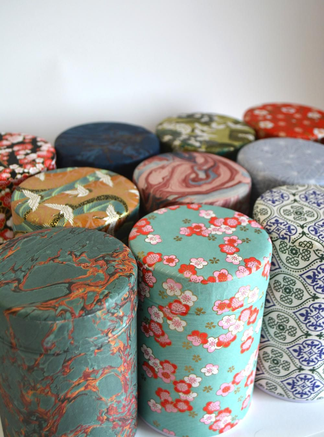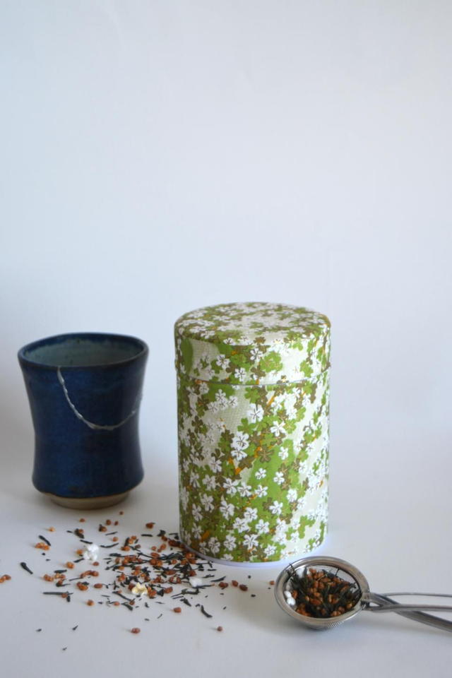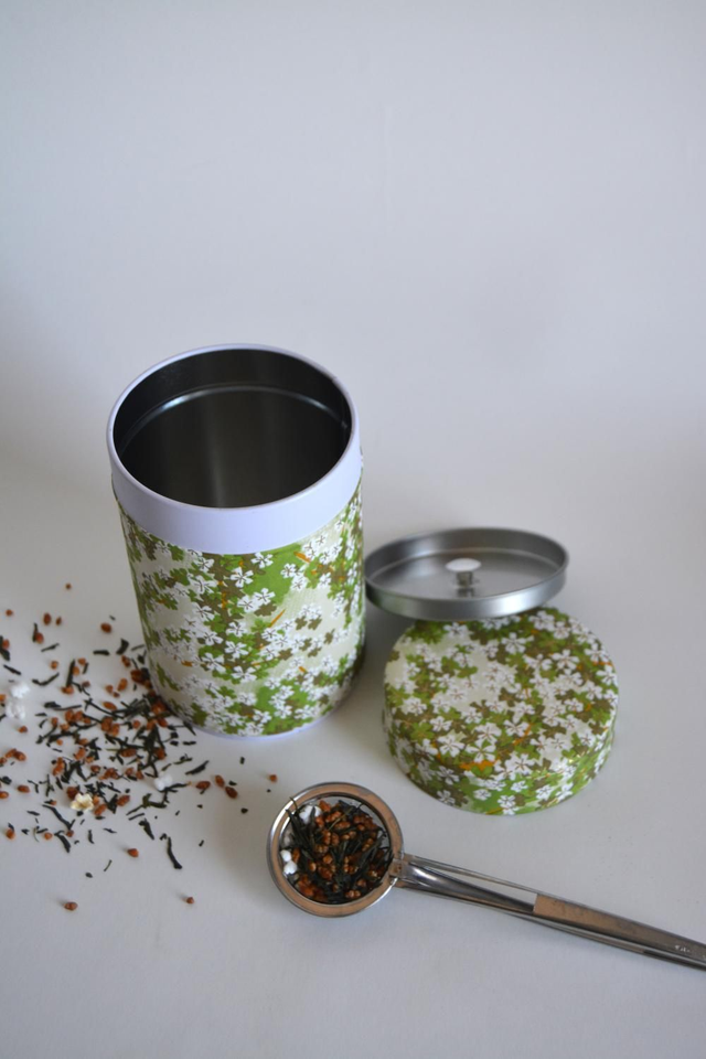 Boîte en métal recouverte d'un papier fabriqué et imprimé au Japon. Contenance d'environ 150g de thé (suivant la densité) avec un couvercle à double opercule qui permet de conserver au mieux le thé de l'humidité et de garder ses saveurs.