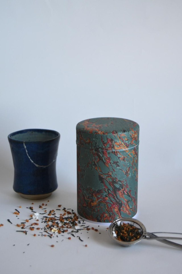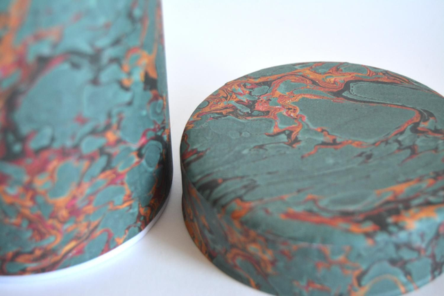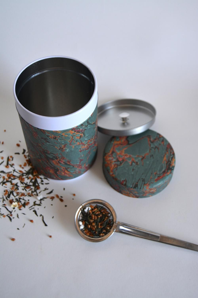 Boîte en métal recouverte d'un papier fabriqué et imprimé en France d'un papier marbré traditionnelle. Contenance d'environ 150g de thé (suivant la densité) avec un couvercle à double opercule qui permet de conserver au mieux le thé de l'humidité et de garder ses saveurs.