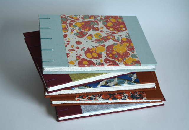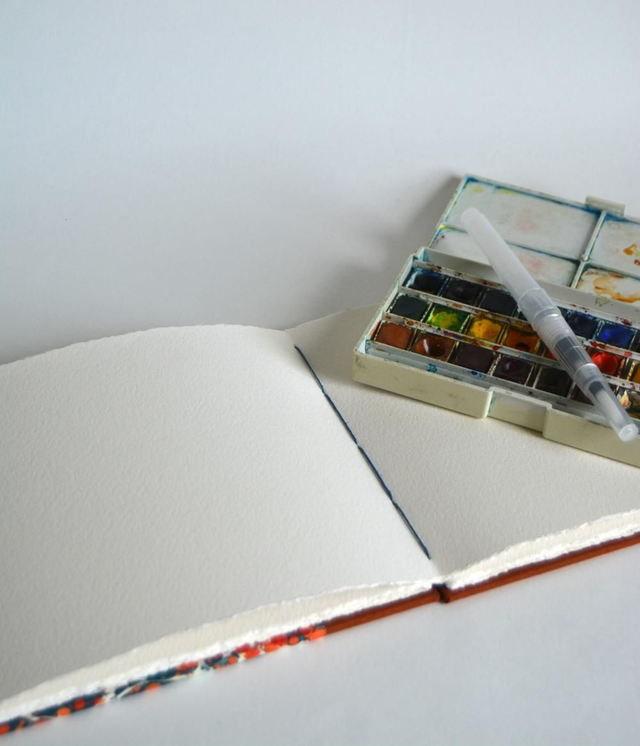 Ce carnet est réalisé entièrement à la main, la reliure est une reliure copte (couture apparente) en fils de lin ciré. La couverture est très solide, en toile de reliure et papier. La reliure copte permet une ouverture jusqu'à 360°, elle permet surtout une bonne ouverture à plat pour réaliser des doubles pages.