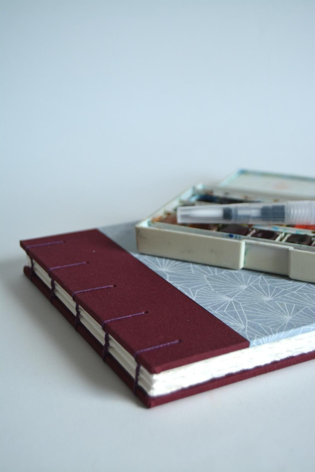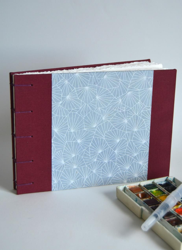Carnet aquarelle en toile bordeaux et papier népalais gris à motifs géométriques.
