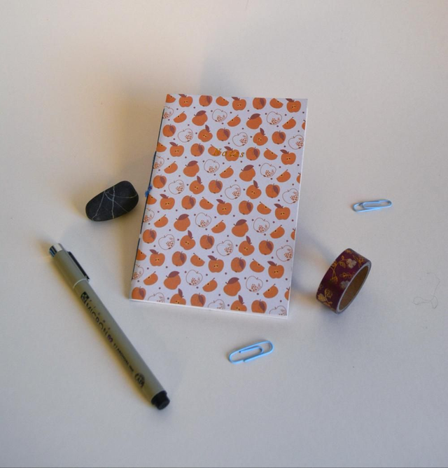 Petit cahier cousu format A6, couverture souple en papier épais à motifs mandarines.